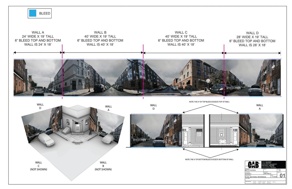 The entire set was 360 degrees. It was printed on wallpaper material. The wall space was 18' tall but the wallpaper was printed at 19' to give 6" bleed at top and bottom. The entire backdrop was 132' wide and 18' tall.